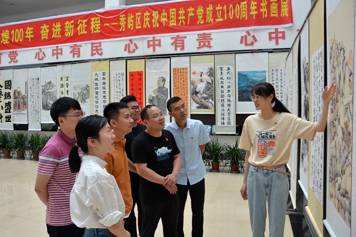 党史学习教育开展以来,福建省莆田市秀屿区纪委监委坚持对标对表,学在先、干在前、作表率,通过参观书画展、观看红色影片、分享学习心得等形式,教育引导纪检监察干部将党史学习教育融入日常、抓在经常,为党史学习教育提质增效。图为日前,该区青年纪检监察干部在参观“辉煌100年 奋进新征程”书画展。(秀屿区纪委监委)